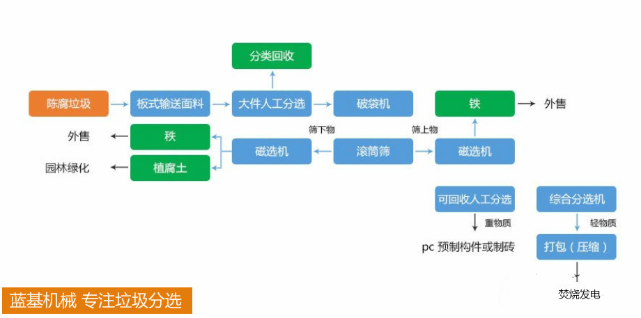 通過滾筒篩分機將陳腐垃圾分為篩下物、篩上物兩部分,其中篩下物經磁選機選出鐵磁物,其他物料成為腐殖土;篩上物經過磁選機選出鐵磁物,其他物料輸送至綜合風選設備。